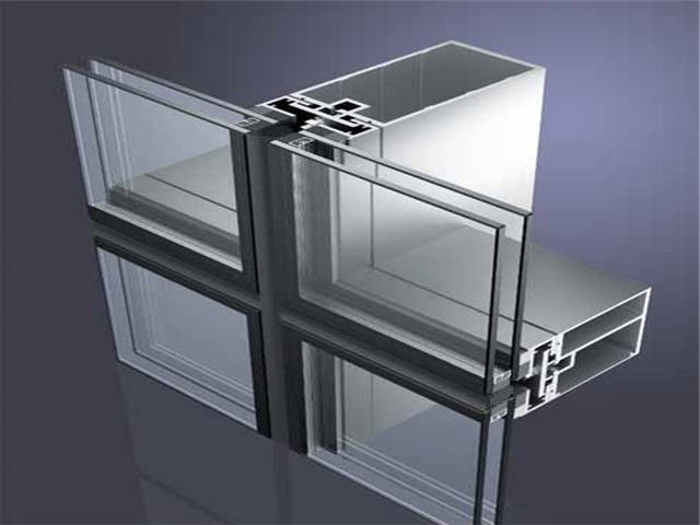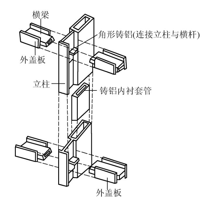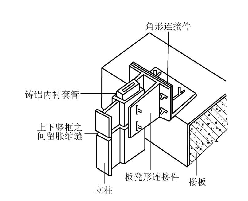 用特殊断面的铝合金型材作为玻璃幕墙的骨架,玻璃镶嵌在骨架的凹槽内。玻璃幕墙的立柱与主体结构之间,用连接板固定。