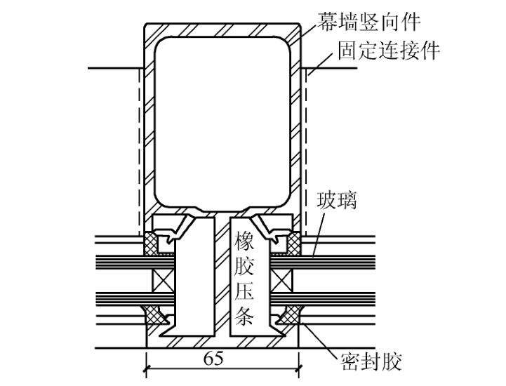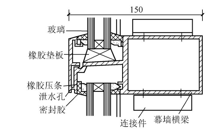 横梁装配玻璃与立柱在构造上不同,横梁支承玻璃的部分呈倾斜,要排除因密封不严流入凹槽内的雨水,外侧须用一条盖板封住。安装构造如图1-16所示。