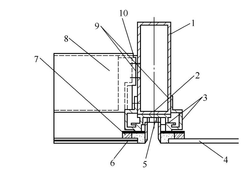 1-立柱;2-聚乙烯泡沫压条;3-铝合金固定玻璃连接件;4-玻璃;5-密封胶;6-结构胶、耐候胶;7-聚乙烯泡沫;8-横梁;9-螺栓、垫圈;10-横梁与立柱连接件