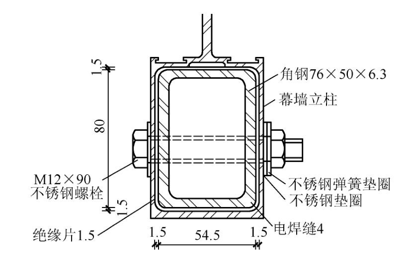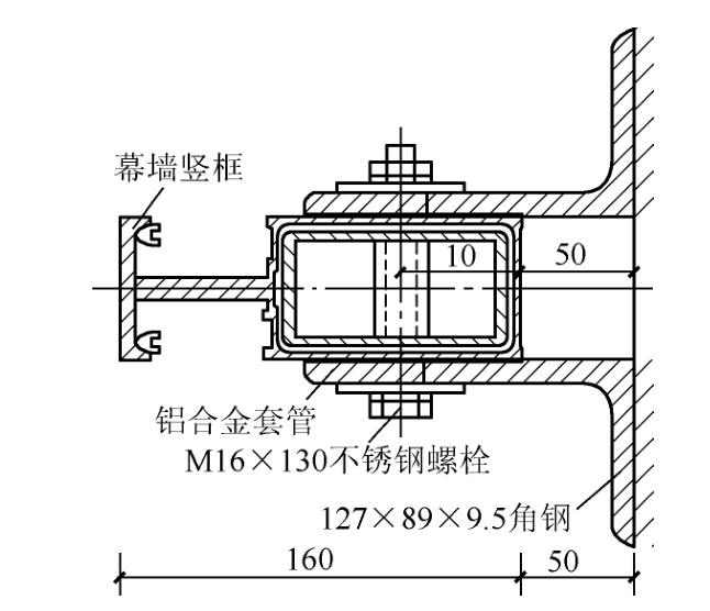 在采用铝合金横立柱型材时,两者间的固定多用角钢或角铝作为连接件。角钢、角铝应各有一肢固定横立柱