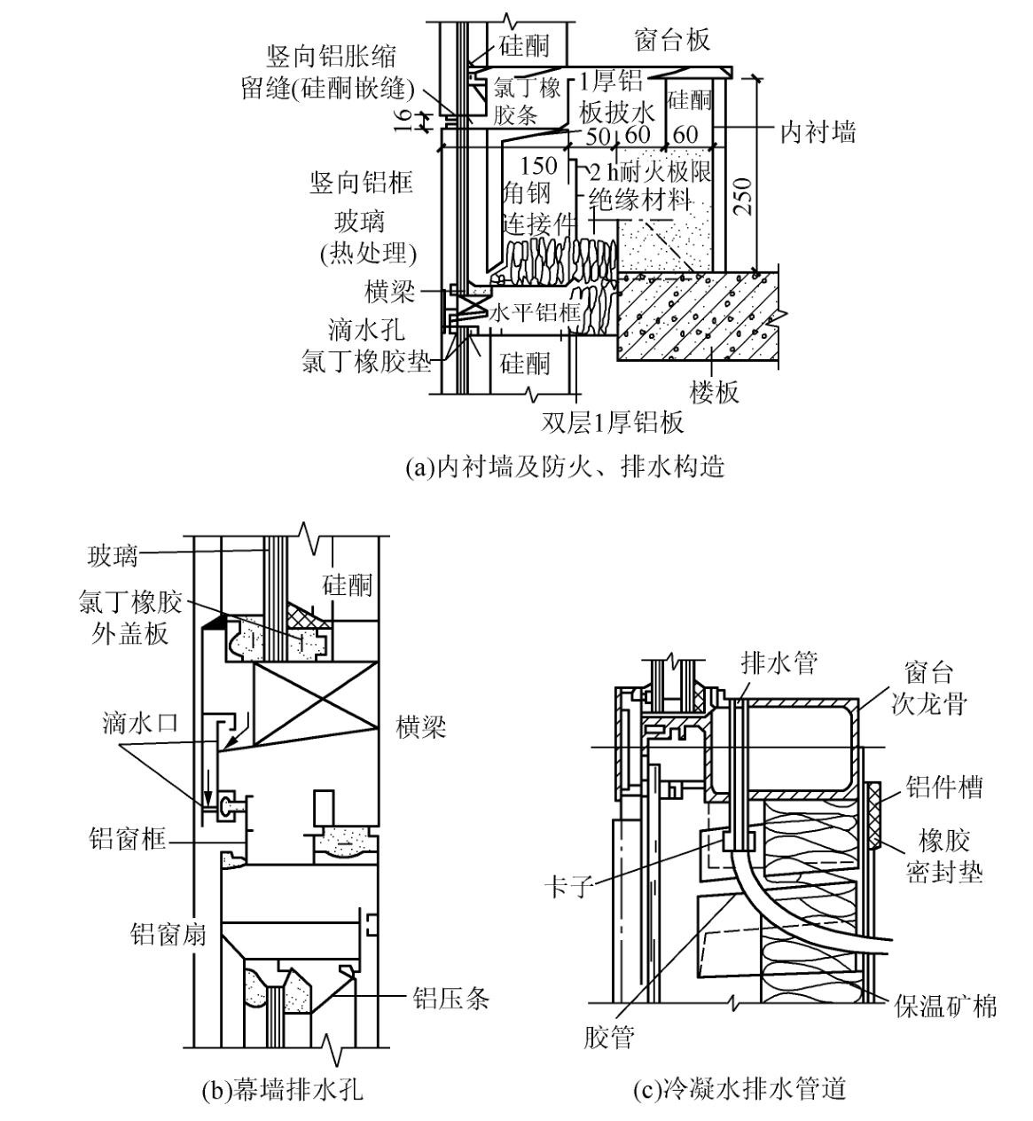 由于幕墙与柱、楼板之间产生的空隙对防火、隔声不利,所以,在做室内装饰时,必须在窗台上下部位做内衬墙,内衬墙的构造类似于内隔墙,窗台板以下部位可以先立筋,中间填充矿棉或玻璃棉防火隔热层,后覆铝板隔汽层,再封纸面石膏板,也可以直接砌筑加气混凝土板。
