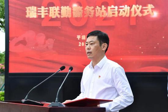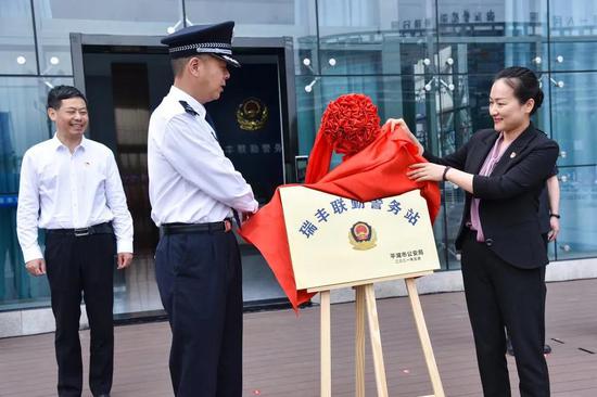 在仪式上,徐玉峰和蒋娟芬一同为警务站揭牌,宣布瑞丰联勤警务站正式启用。